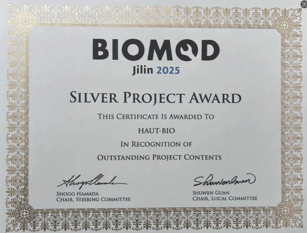 国际生物分子设计大赛(BIOMOD)是一项面向全球本科生的高水平国际学术竞赛,2011年由哈佛大学发起,致力于推动合成生物学、纳米技术等前沿领域的跨学科创新。本届BIOMOD于2025年10月17日至19日首次在中国举行,由吉林大学承办,吸引了来自中国、中国台湾、日本、加拿大、美国、印度尼西亚、印度的19所高校的队伍同场竞技。河南工业大学生物工程学院代表队HAUT-BIO以生物大分子为“构建单元”,设计并组装具有新颖功能的纳米器件与分子系统,最终凭借出色表现获得项目银奖。