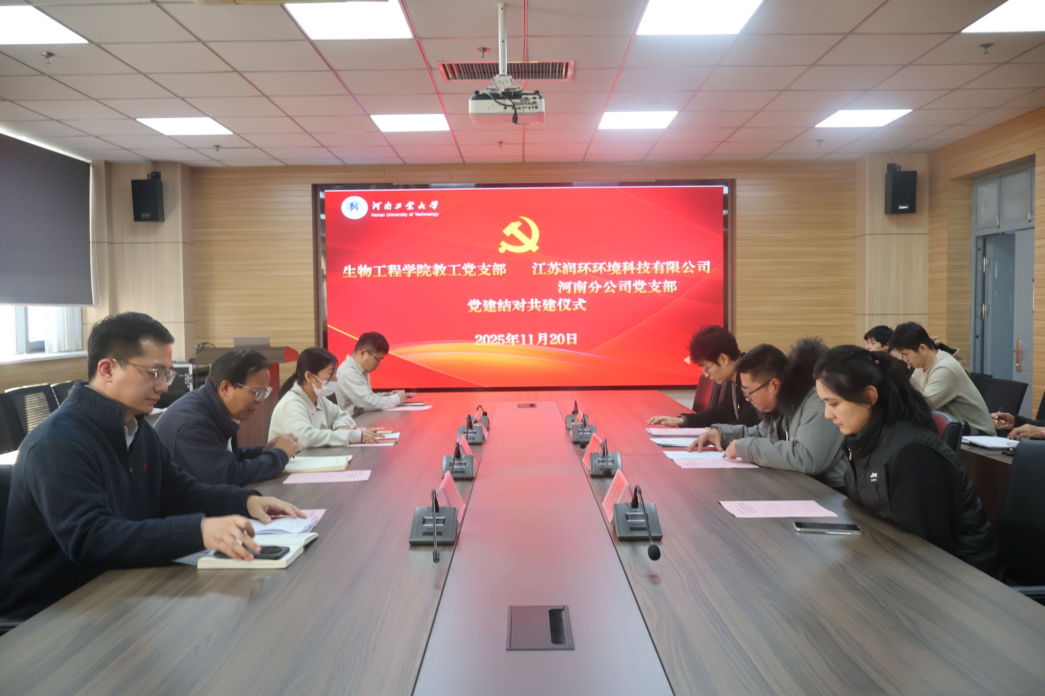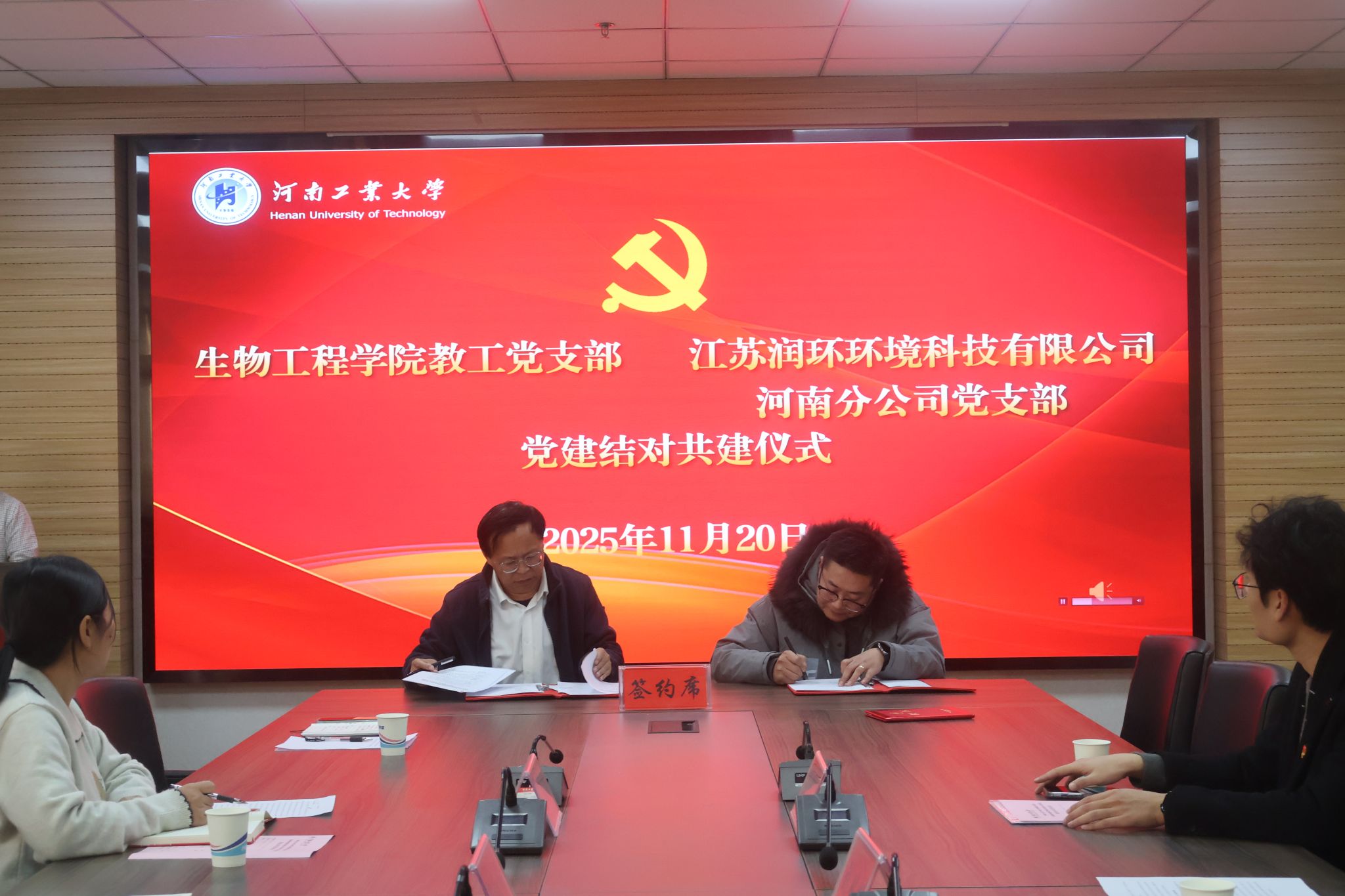为深入贯彻落实党的二十大精神,全面推进新时代高校党建“双创”工作,积极探索“校企党建共建、产学研用融合”的新路径,11月20日下午,生物工程学院教工党支部与江苏润环环境科技有限公司河南分公司党支部在惟德楼1313会议室举行结对共建签约仪式。我校生工2001级校友、江苏润环环境科技有限公司河南分公司总经理刘从彬,生物工程学院党委书记卫红伟、动物科学系教工党支部书记乔汉桢、全体辅导员及党员代表参加了仪式。仪式由生物工程学院党委副书记蔡永平主持。