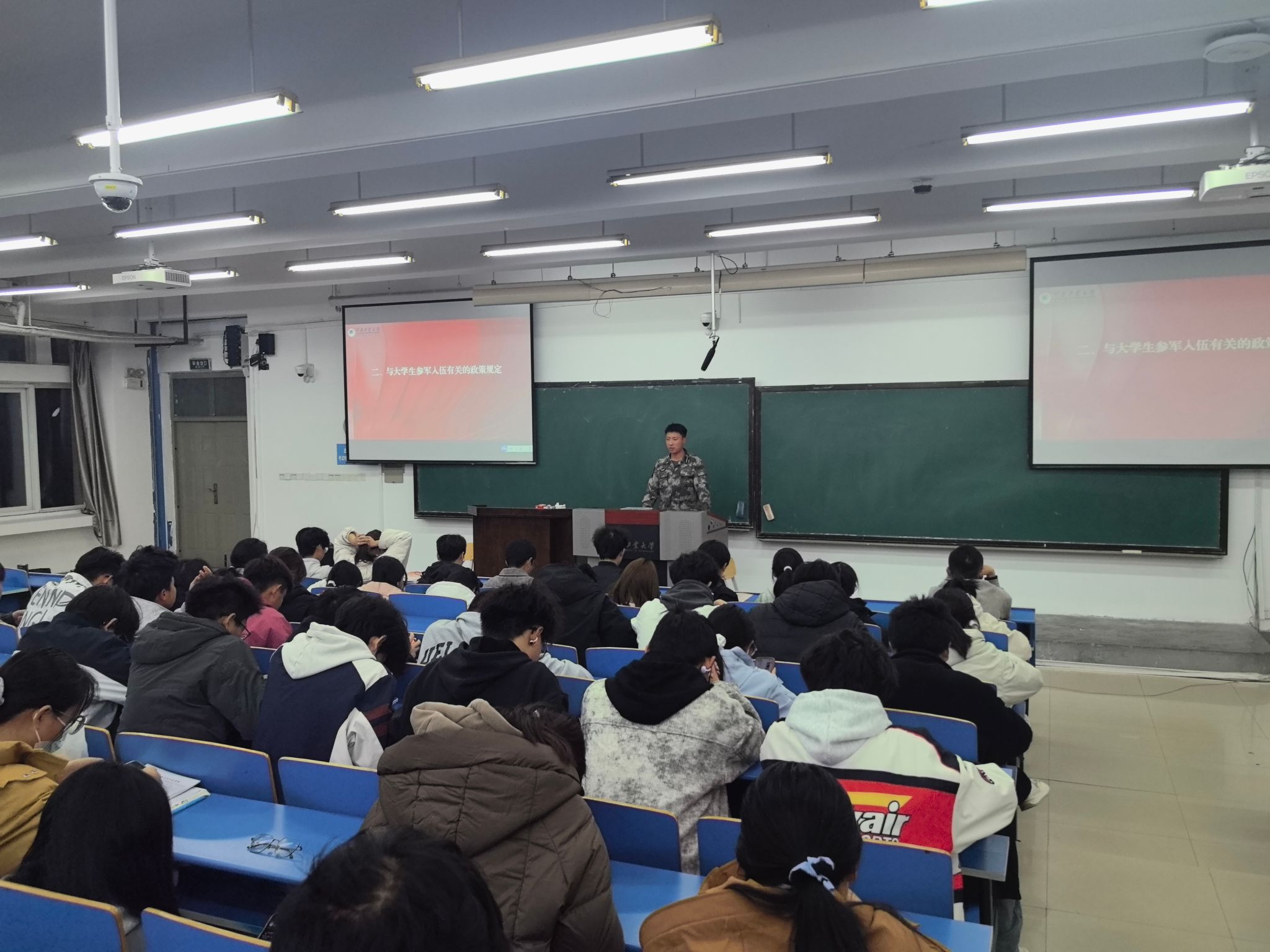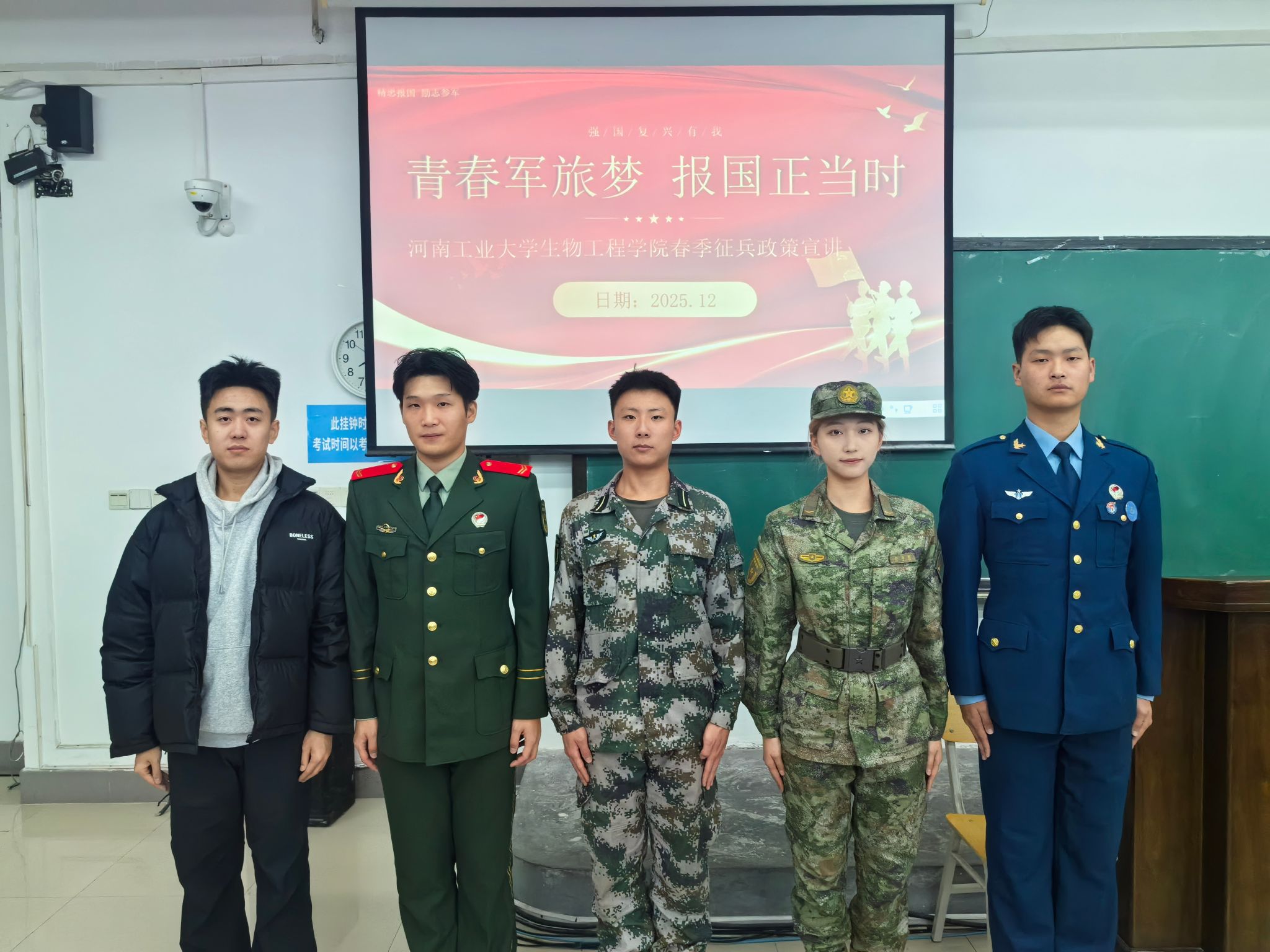 为激发我院大学生参军报国热情,鼓励他们响应国家号召,携笔从戎、投身军营,为国防事业贡献力量,12月4日下午,生物工程学院在4号楼4322教室举办了大学生征兵宣讲会。河南工业大学退役大学生征兵宣讲团成员孙旸坤、姬翔、陈勇、郭雨梵和刘子通为同学们分享了参军的经历,并讲解了应征入伍的政策。此次宣讲会吸引了生物工程学院百余名学生的积极参与。