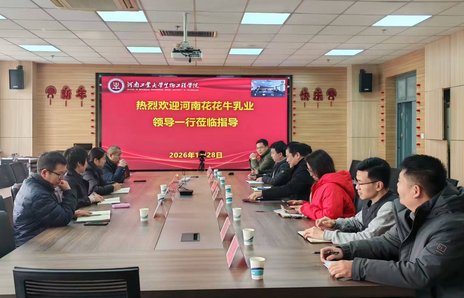 2026年1月28日,河南花花牛乳业集团股份有限公司总经理助理兼人力资源管理部总监李倩影、质量管理总监赵广英、研发总监姜波、乳品事业部运营部马永升一行就提升牛奶风味、打造优质特色产品来我院寻求交流合作。我院党委书记卫红伟、院长胡元森、副院长梁赢、“畜牧学”学科带头人王金荣教授及学院部分骨干教师共同参会。