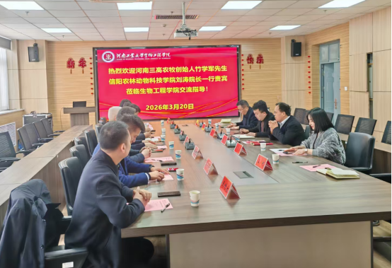 2026年320日,河南三高农牧股份有限公司创始人竹学军信阳农林学院动物科技学院副院长刘涛、河南固佳食品有限公司总经理刘杨、河南固佳食品有限公司技术总监齐玉波、河南思辨商业管理有限公司董事长雷永辉一行就黑猪产业液态发酵饲喂技术来我院寻求交流合作。我院党委书记卫红伟、副院长梁赢、营养调控与饲料资源高效利用团队负责人张勇副教授及团队部分骨干教师共同参会。